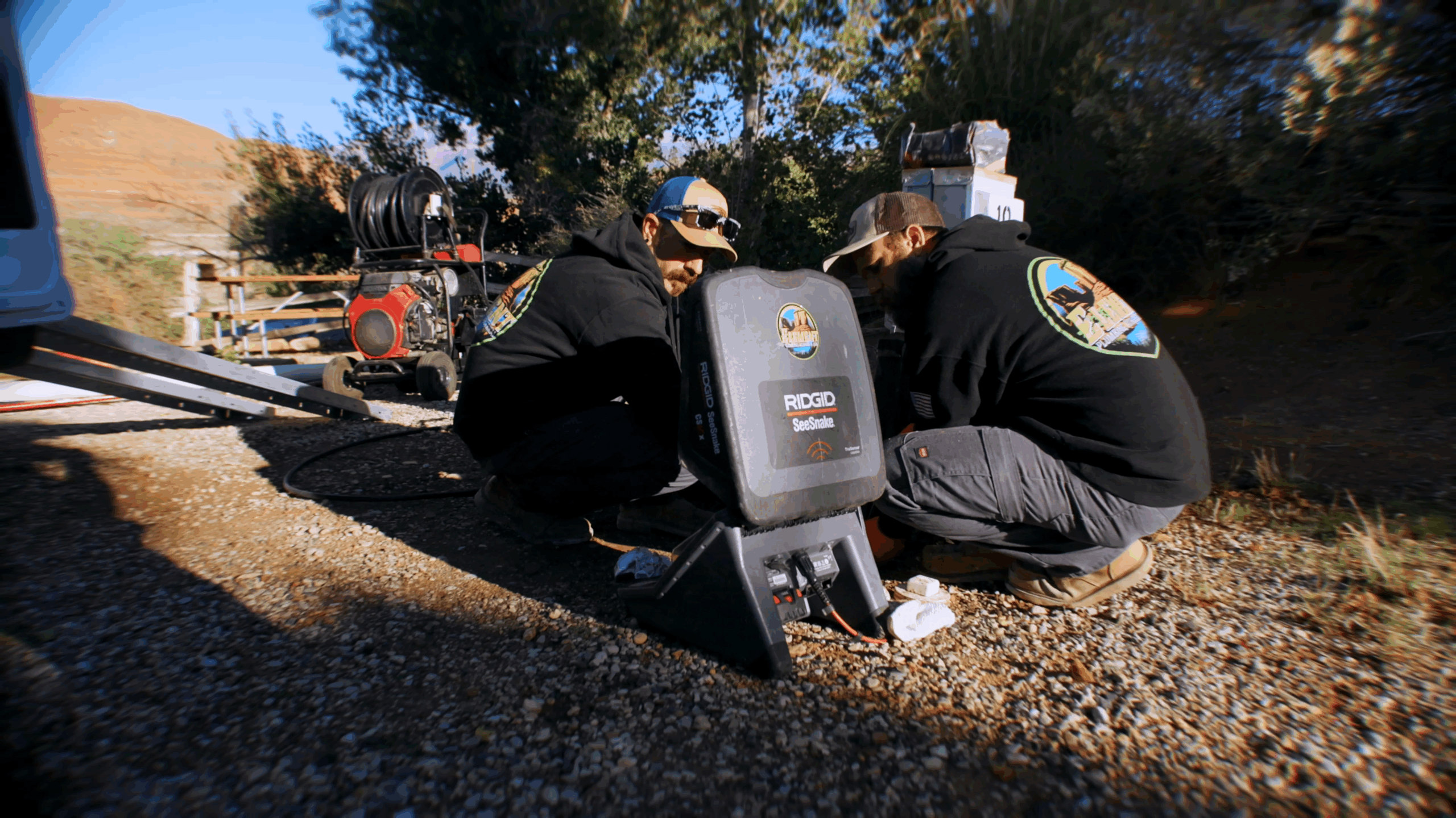 Element St. George plumber working with a RIDGID SeeSnake CSx VERSA inspection camera near a utility box during outdoor leak detection and repair service in St. George, UT.